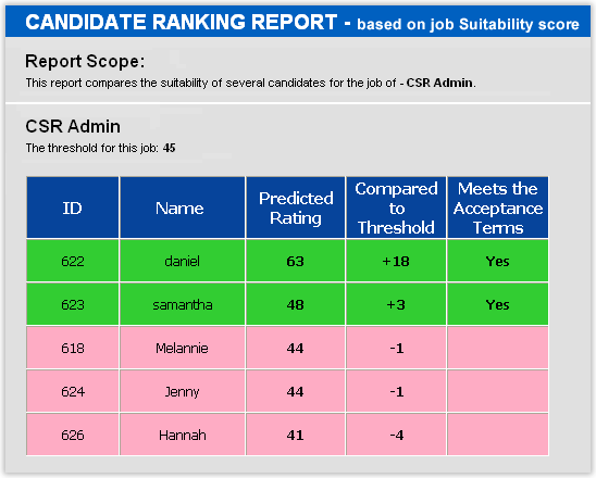 HRVision has developed a unique tool that enables one step ranking of any number of candidates for a designated job. Once candidates for the job have been tested on the HRVision test battery, the ranking mechanism compares each candidate's suitability (and comparison to acceptance thresholds) to the specific job in top down order. Built right into the solution platform, the resulting report will aid any recruiter in easily identifying the potential top performers for an easy callback.