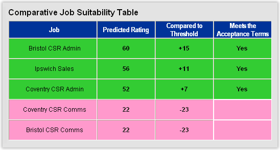 HRVision has developed a unique tool that enables one step matching of a candidate to any number of available job positions in an organization. Built right into the solution platform, this ranking mechanism calculates suitability (and comparison to acceptance thresholds) to each relevant job profile. The resulting report, indicating job suitability in descending order, is an easy to read and valuable reference for job placement within an organization.